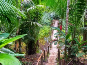During the transfer to Bellavista Nanay, a brief orientation is provided about the city of Iquitos, its main attractions, and its transformation in the 19th century during the “Rubber Boom,” when it grew from a small town into an important cosmopolitan river port. Upon arrival at the tourist pier, there is a 15 to 20-minute walk to learn more about Amazonian gastronomy before boarding comfortable boats to navigate the Amazon River, one of the 7 Natural Wonders of the World. The landscape combines the immensity of the river with the lushness of the rainforest and riverside villages. The first stop is at the confluence of the Amazon and Nanay rivers, where the contrasting water colors can be appreciated without mixing.